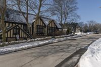 a road with several houses and no vehicles in the middle of it with some snow on the ground