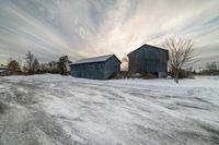 This stock photo captures the serene beauty of two old barn buildings surrounded by snow-covered trees in a rural area of Canada. The image showcases the picturesque winter scenery at sunset, with clouds moving over the sky. The peaceful setting and the soft golden light of dawn create a tranquil ambiance. The snow-covered road, asphalt, and shed further enhance the rustic atmosphere. Perfect for illustrating the beauty of Canadian landscapes and the charm of rural living.