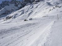 a snow skier traveling on a steep snowy slope with his skis on it's feet