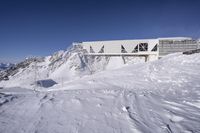 This stock photo showcases a stunning winter landscape in France, Europe. The mountain range, covered in snow, creates a picturesque view. At the top, a building with a walkway over it adds a unique touch to the scene. The clear sky enhances the overall beauty of this tourist attraction. This photo captures the tranquility and beauty of nature in the Alps, making it a perfect representation of winter tourism. The surface is covered in snow, inviting ski enthusiasts to enjoy the Piste and explore the glacial mountains. The image also provides an overview of the massif, giving viewers a sense of the scale and majesty of the mountains in this region. Step into this scenic image and imagine yourself on a gondola, admiring the breathtaking sight of the snow-capped mountains.