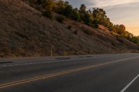 This stock photo captures a woman riding her bicycle down a rural road during sunset. The golden light of dawn illuminates the scene, creating a warm and inviting atmosphere. The woman is framed by rolling hills and lush vegetation, with trees lining the sides of the road. The smooth asphalt surface of the road contrasts with the natural terrain and adds to the sense of tranquility. Clouds dot the sky, adding depth and texture to the image. This photo perfectly captures the beauty of the countryside and the joy of outdoor cycling.