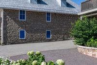A woman walks past a home with a blue window in Toronto, Canada. The home is adorned with several white flowers, creating a picturesque scene in the city. This stock photo captures the beauty and charm of Toronto, with its vibrant neighborhoods and unique architecture.