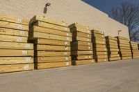 A sunny day in front of a wood lumber company. Pallets of wood are stacked by the side of the building. A clear sky and a sign for the retail business create a vibrant scene.