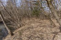 a wooded area next to a river, with no leaves on it and a bunch of dry brown grass