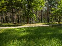 This stock photo features a beautiful forest landscape in Berlin, Brandenburg. The image shows a wooded area with lush green grass and tall trees. A dirt trail leads through the forest floor, providing an off-road track for nature enthusiasts. The sunlight filters through the tree branches, creating a peaceful and serene atmosphere. The ground is covered with vegetation and wetland, creating a vibrant and green environment. The gravel and tree trunks add texture to the image, making it visually appealing. This photo depicts the natural beauty of Berlin's outdoor scenery and is perfect for showcasing the city's nature and off-road adventures.