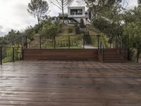 This image features a wooden deck and steps leading up to the bottom deck of a home. The deck offers a stunning view of the surrounding trees, creating a tranquil and natural ambiance. The luxurious California property showcases the perfect blend of nature and architecture, making it an ideal home. The wooden floors and boardwalk add warmth and charm to the house, while the cloud-filled sky in the backdrop completes the scenic view. This photo is perfect for real estate, landscape, and outdoor-themed projects.