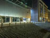 A modern architecture building in Berlin, Germany. Its yellow facade stands out against the dark night sky. The building's windows illuminate the empty street, surrounded by brick walkways. A symbol of Berlin's metropolitan charm.