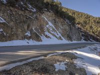 A picturesque winter landscape in the highlands of Shangri-La, Yunnan, China. The rugged mountain range is covered in snow and surrounded by a clear sky. A winding road cuts through the wilderness, showcasing the natural beauty of this Asian paradise.