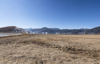 Expansive sandy field in Shangri-La, Yunnan, China. Majestic snow-capped mountains in the distance provide a breathtaking backdrop to this tranquil landscape. Clear skies and open spaces make it a perfect day to immerse yourself in nature.