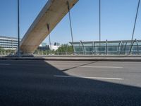 A modern architecture bridge in Zaragoza, Spain. The city's urban design is showcased with its sleek and elegant bridge. The clear sky casts hard shadows on the asphalt road, creating a dynamic cityscape.