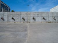 the empty parking lot in front of a wall with apartment buildings on it and a skateboarder on a ramp