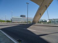 A modern bridge in Zaragoza, Spain, casting long shadows on the asphalt road. The city's urban design and architecture reflect the vibrant city life. The clear sky and European atmosphere add to the beauty of the scene.