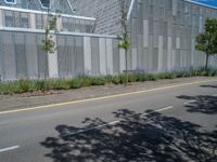 A modern architectural marvel in Zaragoza, Spain. The metal walls cast hard shadows on the asphalt road. Clear skies and clouds provide a stunning backdrop to this urban landscape in Europe.