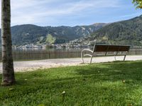 a bench that is sitting on the grass near a river shore and mountains behind it