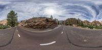 A top-down aerial view of a straight road cutting through the stunning landscape of Zion National Park in Utah, USA. Majestic mountains and clear skies create a breathtaking scene.