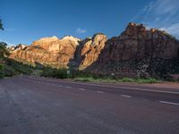 A road in Zion National Park, Utah. The asphalt stretches into the distance, creating a hard shadow under the morning sun. The majestic mountains and natural landscape surround the road, creating a picturesque scene.
