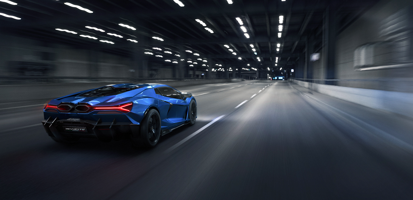 In a final series of renders, we see the Revuelto rounding a corner and crossing over a bridge. The blue hue of the lighting on the bridge complements the blue bodywork of the Revuelto, which is shown in extreme close-up in several other renders.