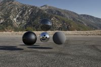 the road is empty in this view from above the mountains, and there is a sun in the sky