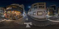 a fisheye lens captures the streets of a city at night time a man is on the street