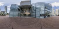 a 360 degree panoramic view of a building and walkway with rows of dots of concrete that appear to be created into a curve