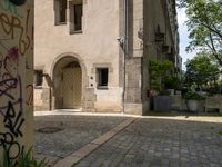 The streets of Berlin, Germany are alive with classic architecture, urban design, and cobble stone roads. Facades, houseplants and trees line the alleyways and thoroughfares, framed by the tints and shades of dawn's light. Motor vehicles, bicycles, and even a gas fixture in the foreground show the life that pulses in this vibrant European city.