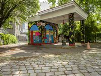 A snapshot of a leisurely walkway in Berlin, Germany, featuring a diverse combination of urban architecture, street art, botany, and more. The cobble stone road surface, gas station, graffiti wall, and leafy tree provide a visual representation of the city's adaptation to its European environment.