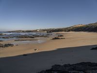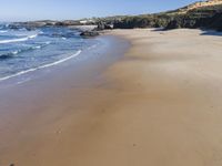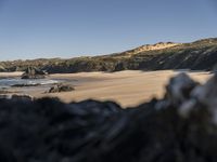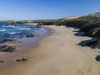 From above, the azure ocean of Portugal meets the grey landscape of the lacustrine plain, featuring aeolian landforms, mountain ranges, and forests. The sun casts a hard shadow on the terrain, revealing the unique patterns of the natural environment.