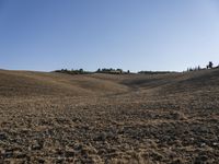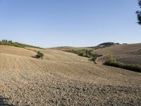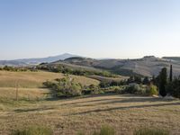 A scenic view of a winding road overlooking the vast array of aeolian landforms in Tuscany, Italy. The pristine landscape is dotted with grass, conifer, and cypress trees, as well as chaparral and shrub vegetation. The clear blue sky and sunshine create a peaceful atmosphere for a road trip or vacation.