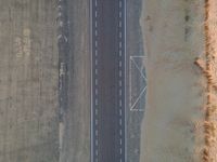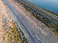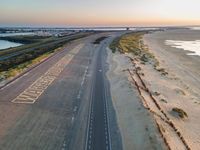 An aerial view of the Netherlands at break of day reveals the Aeolian landforms in the beige and brown hues of the desert, beach, grass, and asphalt that make up this unique biome. The horizon is outlined by the azure lake and ocean, and the sunlight paints the trees and metal infrastructure in tints and shades of the rising sun.