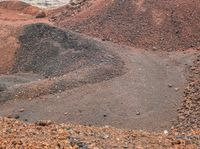 An aerial view of an off road track winding through a makhtesh, a geological phenomenon in the highlands of Israel. A variety of landforms, including mountains, hills, and valleys, are visible in the landscape, along with a patchwork of vegetation, grass, rock, soil, gravel, asphalt, and a lake. Cumulus clouds drift across the sky, illuminated by the warm sunlight of a bright day.