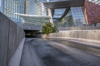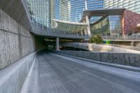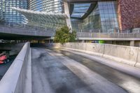 An aerial view of a modern business district in Los Vegas, USA, featuring office buildings, roads, and bridges.