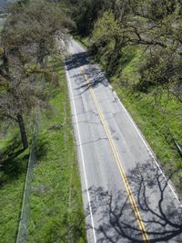 An elevated perspective captures the green and vibrant nature of California, as a straight road cuts through the lush forest under a clear sky.