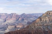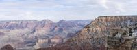 An aerial view of the stunning mountain landscape in Colorado, USA, with snow-covered peaks, rocky cliffs, and a grey sky.