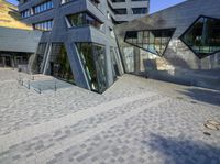 An elevated shot of a futuristic architectural structure in a modern city, showcasing the urban design and top-down view.