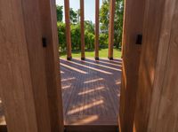 An elevated perspective shows the stunning coastal architecture of Hong Kong, with clear skies and a straight road leading towards the ocean. The wood floor and hard shadows create a beautiful contrast.