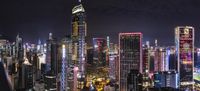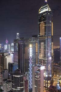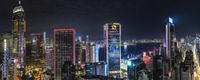 An elevated aerial view of Hong Kong's stunning modern architecture and cityscape at night, showcasing high-rise buildings, skyscrapers, and neon lights in the bustling metropolis.