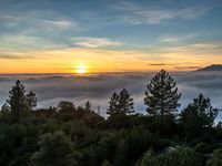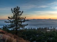 an orange sky above the clouds on a mountain side at sunset with trees and hills below