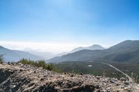 a sky view over a mountain surrounded by fog at sunset time with hills in the background