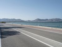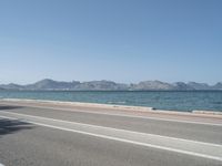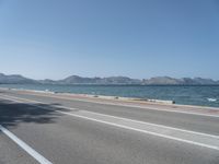 A top down view of Mallorca, Balearic Islands, Spain, showcasing its coastal nature, elevated road, and graffiti wall, with a clear sky and kitesurfers in the ocean below.