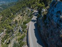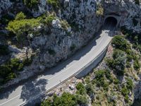 A top down view of Mallorca in the Balearic Islands of Spain shows the coastal landscapes, oceans, and roads from an elevated and aerial perspective. The clear sky day showcases the road leading to a tunnel with a profile view of the high nature of the landscape.