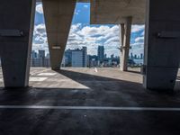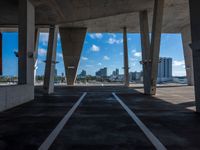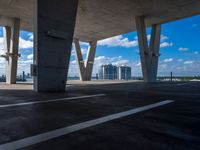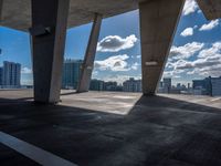 A sunny day in Miami Beach, Florida is seen from an elevated, top-down perspective. The skyline of skyscrapers and cityscape of concrete and open spaces is illuminated by the sun, casting hard shadows on the surface below.