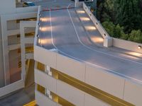 An elevated view of a residential neighborhood in Los Angeles, USA, featuring a parking deck and street lights in the break of day. Artificial light illuminates the asphalt road and driveway from a top down profile, while clouds hover above in a one quarter angle.