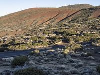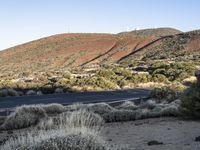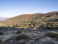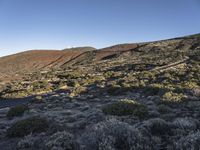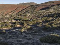 An elevated view of the rugged terrain of Tenerife, Spain featuring rock formations, chaparral vegetation, desert, mountain landforms and clear sky. The landscape is dotted with trees, hills and mountains, giving a wild and majestic feeling to the wilderness.