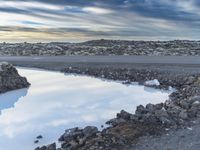 Road winding through the rugged landscape of Iceland with a lake, beach, and coastal lagoon near the horizon. Blue skies, icy atmosphere, and frozen water resources make for a beautiful natural environment with the sun's afterglow illuminating the azure sky, fluffy clouds, and wave-like contrails.