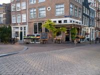 A stunning view of Amsterdam, Holland in the Netherlands, with its vibrant city life, classic architecture, and urban design. The scene includes a busy road with a restaurant, cafe, storefronts, vehicles, bicycles, and vegetation.