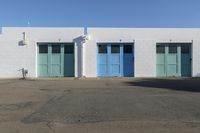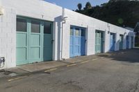 A low-rise residential building in Wellington, New Zealand. The blue facade stands out against the clear sky. This house is located in a suburban area, with a parking garage and open space nearby.