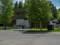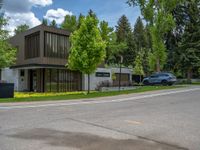 Nestled in Aspen, Colorado, this suburban neighborhood showcases tree-lined streets and residential profiles against a backdrop of clear skies and fluffy clouds. The asphalt roads cast long shadows, creating a picturesque scene with vibrant greenery. The hard shadows add depth to the peaceful suburb, offering a serene atmosphere for a leisurely day stroll.