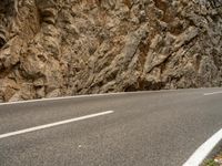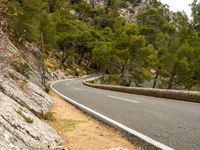 A straight road lined with an Armco barrier, with rock walls, clouds and nature in the background, in Mallorca, Spain, on the Balearic Islands in Europe.