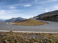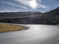 An elevated view of the switchback road winding through an open Austrian landscape, with the sun visible in a clear blue sky and mountains in the foreground.