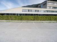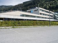 A modern road in Austria stretches straight down the landscape, surrounded by majestic European mountain nature and parking lots. The asphalt surface is illuminated by the sun on a beautiful day.